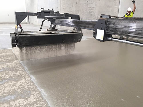 The dry shake wasn’t used to provide additional abrasion resistance or to suppress steel fibres as in the norm when applying a topping, but rather to create greater light reflectivity.